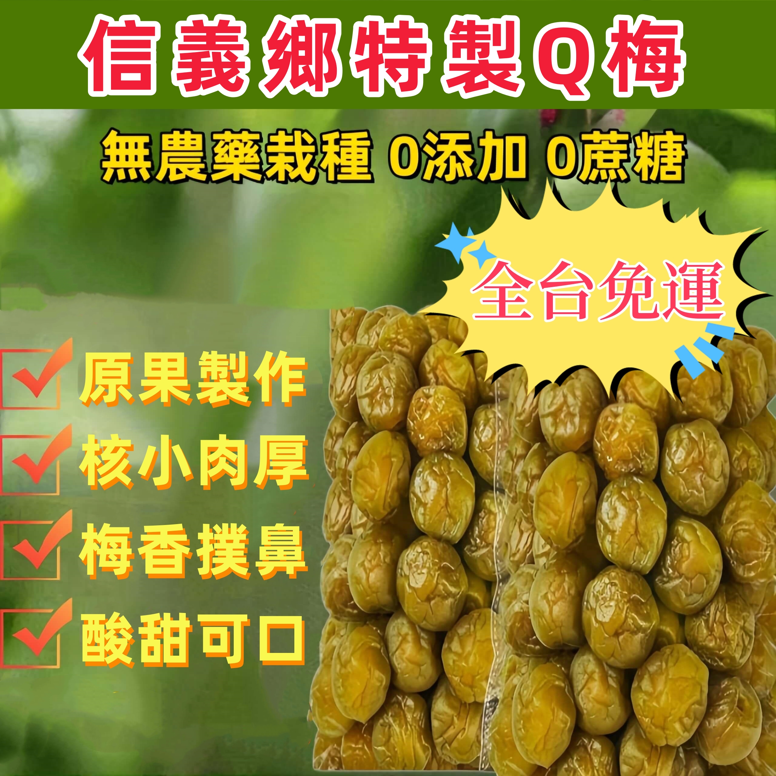 來自南投信義鄉,特製原味Q梅 醃漬濃厚入味、酸甜的Q口感,當休閒零嘴吃、當飯後助消化解膩吃,都超讚!